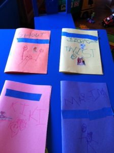 We met up with cousin’s Frankie, Jean, and Maegan at the Beacon Theatre and watched Jack and Maegan enjoy the Fresh Beat Band concert. This show on Nick Jr. is all about music and friends and sharing and has a very positive and upbeat message with each show. Each member of the band wears a specific color, and Jack decided to make cards for each of them.